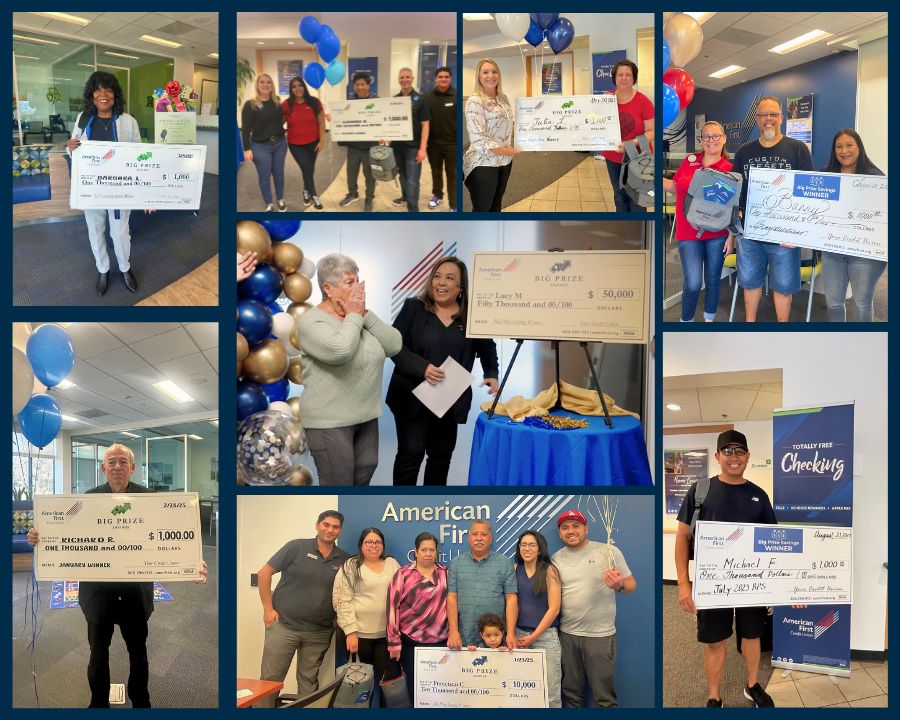 ^Must be 18 years of age or older to open a Big Prize Savings Account. $25 opening deposit required. A minimum of $500 average monthly daily balance is required to be eligible for prize drawings. The standard dividend rate applies with a minimum balance of $500. Exclusions for American First employees, volunteers, family members, and their households apply. Personal accounts only. Other exclusions may apply. The Official Big Prize Savings Rules on this site supersede all print, digital, and other marketing material.